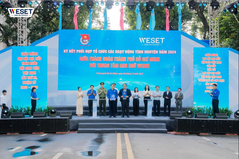 Ngày 03/12/2023, tại khuôn khổ chương trình khai mạc Ngày hội Tình nguyện quốc gia 2023, WESET English Center đã tiến hành nghi thức ký kết biên bản ghi nhớ hợp tác chiến lược cùng Thành Đoàn TP.HCM. Sự kiện quan trọng này được thực hiện nhằm phối hợp tổ chức các chương trình đồng hành, hỗ trợ thiết thực cho con em cán bộ, công nhân viên chức và đặc biệt là thanh niên công nhân trên địa bàn thành phố trong năm 2024.