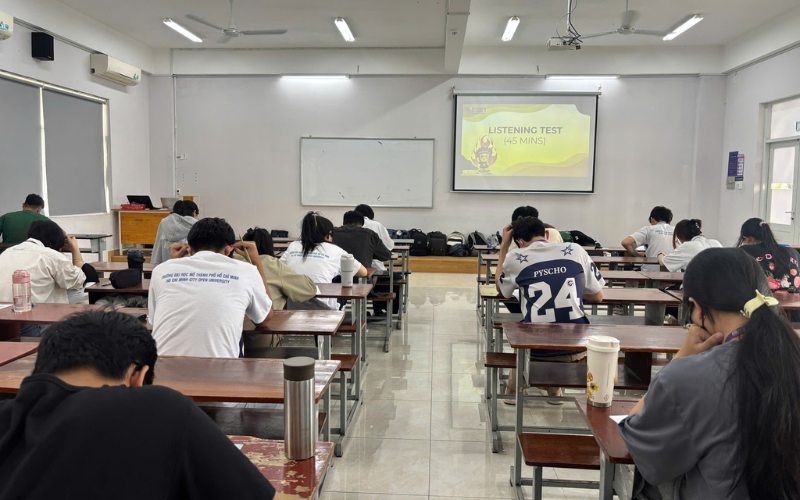 Tại buổi thi, sinh viên OU đã được trải nghiệm không khí của một kỳ thi thật với quy trình tổ chức chuyên nghiệp từ WESET. Bài thi bao gồm 2 kỹ năng cốt lõi: Listening (Nghe hiểu) và Reading (Đọc hiểu), được thiết kế sát với cấu trúc đề thi TOEIC chuẩn quốc tế hiện hành.